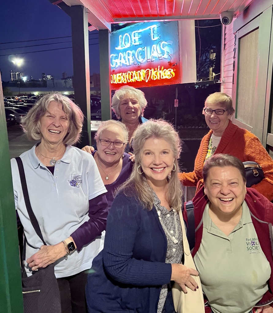 Members of the First African Violet Society of Denton together at FAVSD events, at Lone Star African Violet Association Conference, at holiday get-togethers, and at monthly Lunch and Learn gatherings.